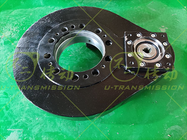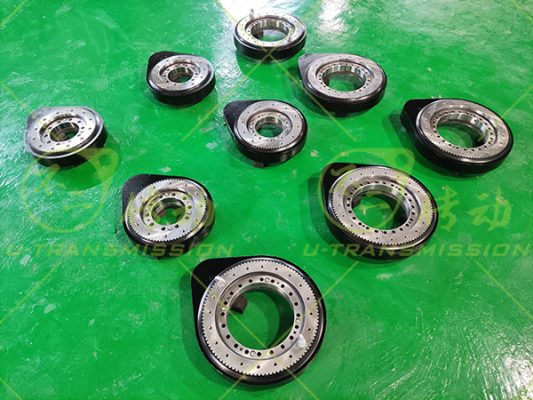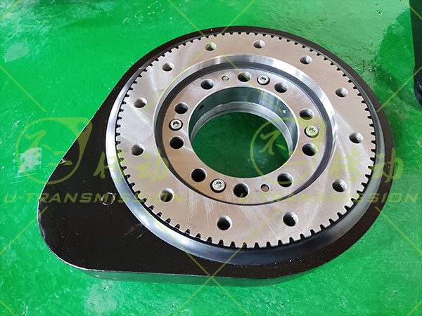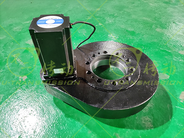 根據(jù)上述工況,采用交叉滾子回轉(zhuǎn)支承,小游隙高精度設(shè)計(jì),確保高頻震動(dòng)下回轉(zhuǎn)驅(qū)動(dòng)旋轉(zhuǎn)平穩(wěn),可靠性高?;剞D(zhuǎn)驅(qū)動(dòng)配套輸出扭矩20N.M的步進(jìn)電機(jī),在設(shè)計(jì)生產(chǎn)成品檢測(cè)過程中始終關(guān)注回轉(zhuǎn)驅(qū)動(dòng)的啟動(dòng)力矩,保證步進(jìn)電機(jī)能夠順利帶動(dòng)直齒驅(qū)動(dòng)工作。