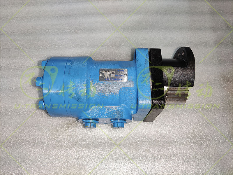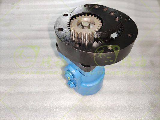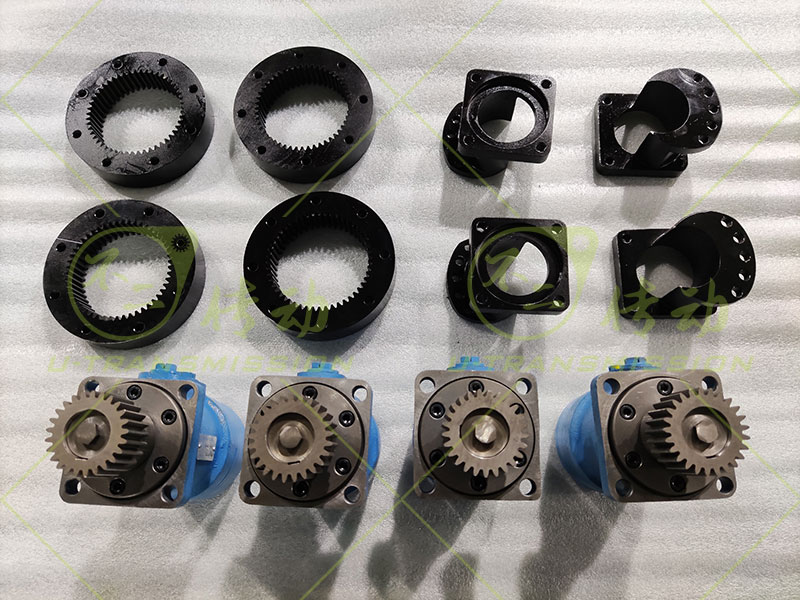 模數(shù)2的微型內(nèi)齒回轉(zhuǎn)驅(qū)動裝置應(yīng)該用在旋轉(zhuǎn)裝置上,偶爾轉(zhuǎn)動90°,安裝空間非常有限,要求體積小,工作時軸向力非常大,不二傳動設(shè)計(jì)生產(chǎn)的小尺寸的回轉(zhuǎn)驅(qū)動不能滿足客戶的使用要求。因此,經(jīng)過工程師和客戶的詳細(xì)溝通,最終決定保留客戶原來的支承方式不變,給客戶設(shè)計(jì)齒輪,內(nèi)齒齒圈,配套液壓馬達(dá),馬達(dá)支座等部件,安裝在客戶原有設(shè)備上,實(shí)現(xiàn)客戶想要的動作。
