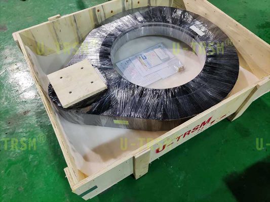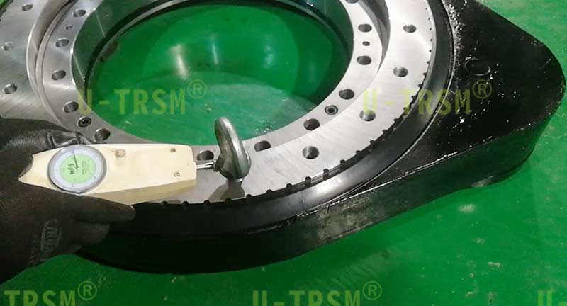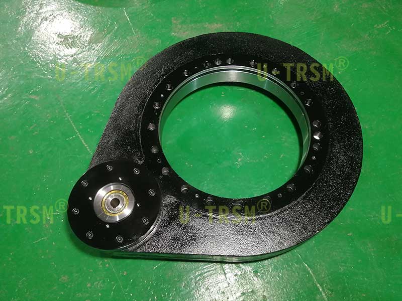 S-III-O-0555 外齒齒輪式回轉(zhuǎn)驅(qū)動(dòng)應(yīng)用在重型機(jī)械設(shè)備上,用來轉(zhuǎn)動(dòng)工件,回轉(zhuǎn)驅(qū)動(dòng)載重不大,但是使用中有較大的傾覆力,設(shè)備的安裝空間比較有限,不能使用回轉(zhuǎn)中心直徑大的驅(qū)動(dòng),綜合考慮最終選擇了重載系列的0555這個(gè)型號(hào)。