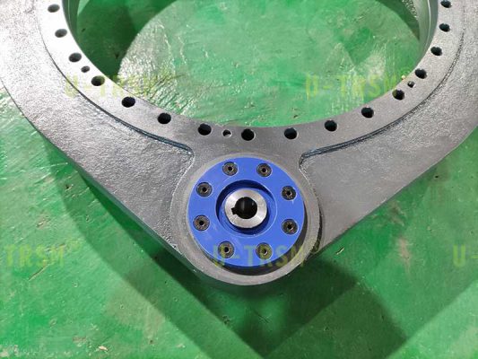 S-I-O-0641齒輪式回轉驅動應用在自動化設備上,是外齒式的回轉驅動,用減速電機帶動旋轉。減速電機不是法蘭輸出形式的,減速電機安裝面與輸出軸承90度分布,受空間限制,不能使用法蘭止口定位,并且法蘭高度必須降低,為了降低法蘭高度,我們采用了特殊設計,把法蘭高度降到最低,滿足了客戶的使用要求。