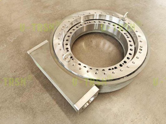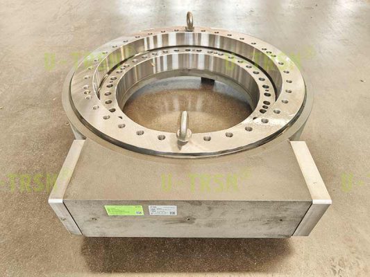 不二傳動(dòng)設(shè)備(洛陽(yáng))有限公司給客戶設(shè)計(jì)了一款大模數(shù),大扭矩,豎直安裝使用的蝸輪蝸桿式回轉(zhuǎn)驅(qū)動(dòng)。該回轉(zhuǎn)驅(qū)動(dòng)用在大型自動(dòng)化設(shè)備上,豎直安裝使用,載荷較大,并伴隨很大的傾覆力矩,回程旋轉(zhuǎn)時(shí)要求穩(wěn)定平順。經(jīng)過(guò)與客戶的多次溝通,不二傳動(dòng)的設(shè)計(jì)師根據(jù)客戶工況,推薦使用蝸輪蝸桿式回轉(zhuǎn)驅(qū)動(dòng),并使用大模數(shù)來(lái)增加回轉(zhuǎn)驅(qū)動(dòng)的扭矩,根據(jù)齒承載及力學(xué)性能分析,輸出扭矩可達(dá)近200KNm。